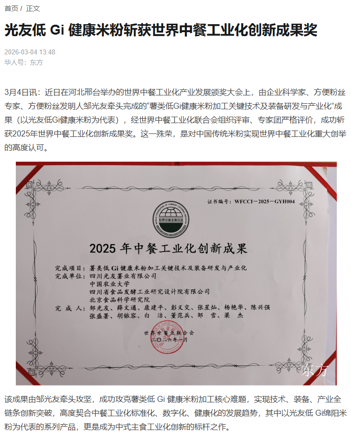 轉(zhuǎn)載華人頭條:光友低 Gi 健康米粉斬獲世界中餐工業(yè)化創(chuàng)新成果獎(jiǎng)